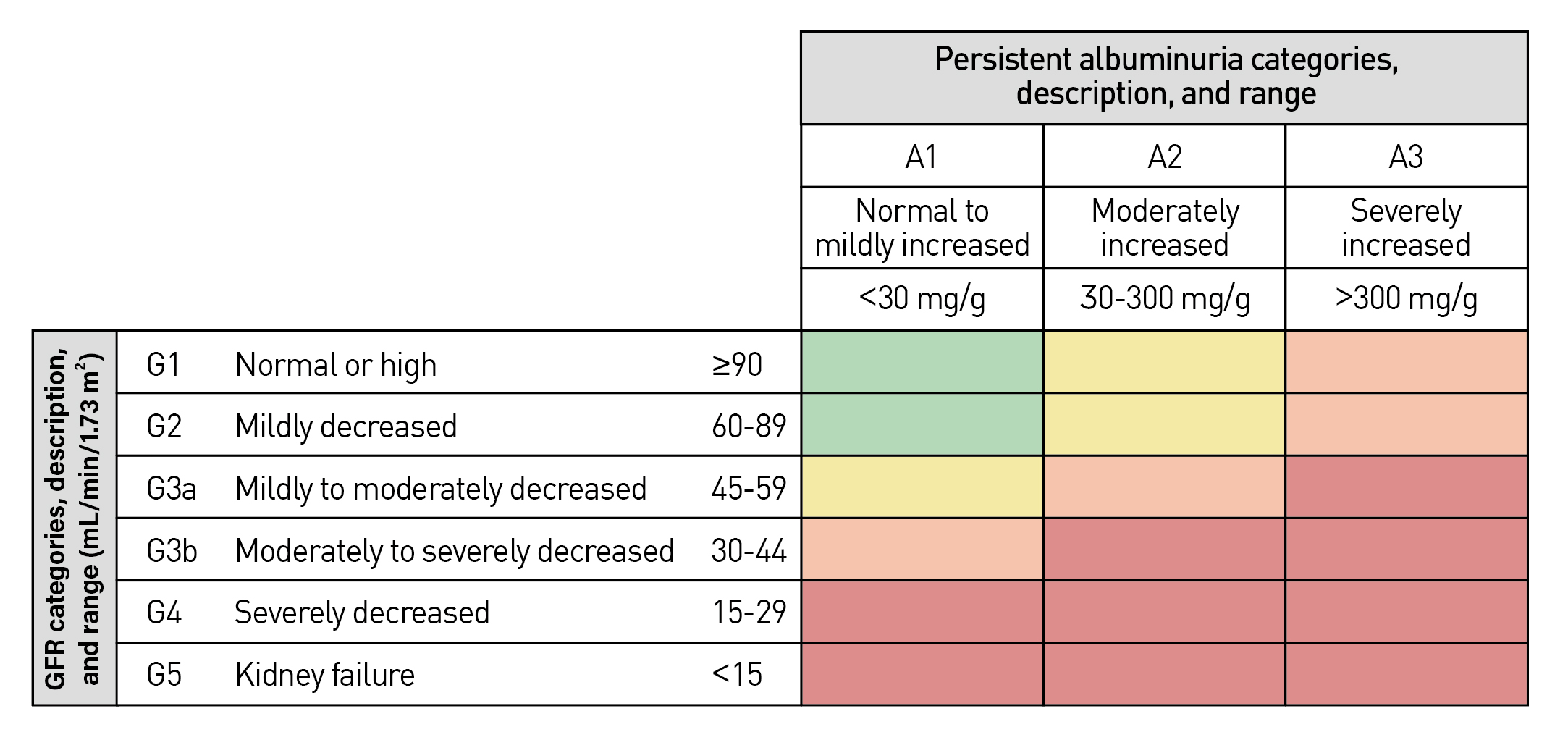 Figure 1. KDIGO Definition and prognosis of CKD by GFR and albuminuria categories, green: low risk; Yellow: moderately increased risk; orange: high risk; red: very high risk7