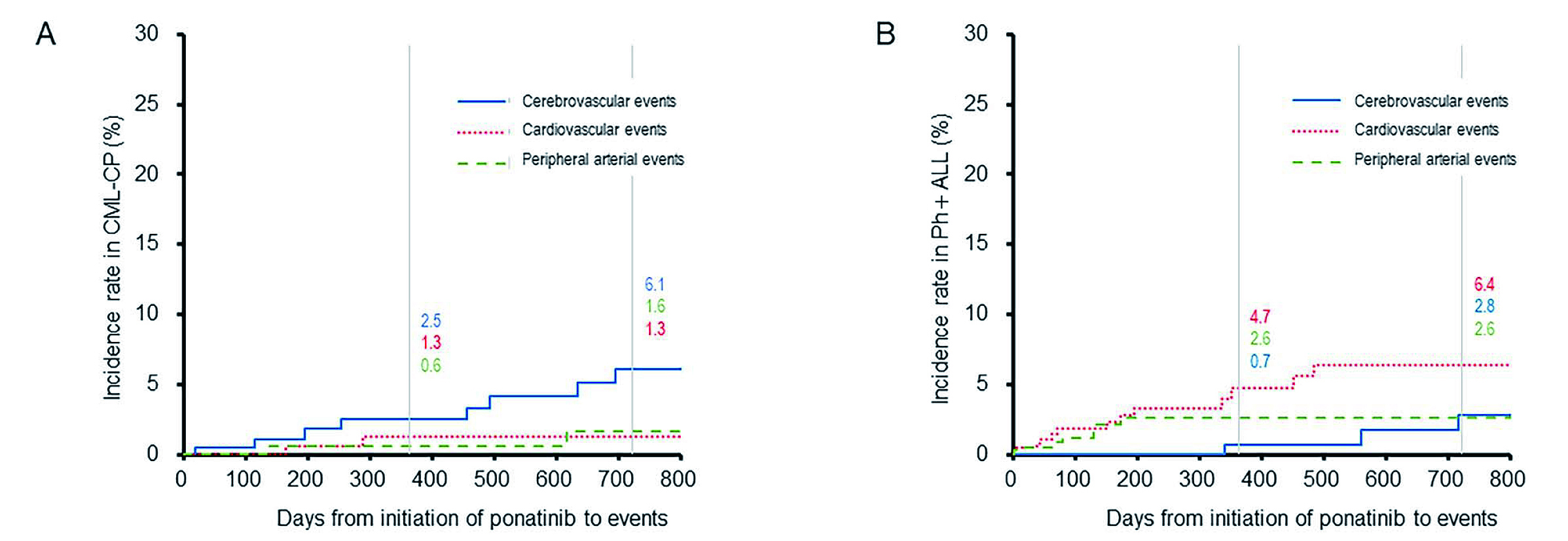 Figure 1. Cumulative incidence rates of arterial occlusive events in patients with CML-CP and Ph+ ALL. The cumulative incidence rates of cerebrovascular (solid line), cardiovascular (dotted line), and peripheral arterial events (dashed line) are shown in patients with CML-CP (A) and Ph+ ALL (B). Incidence rates are labeled at years 1 and 21. CML=chronic myeloid leukemia; CP=chronic-phase; Ph+ ALL=Philadelphia chromosome-positive acute lymphoblastic leukemia.
