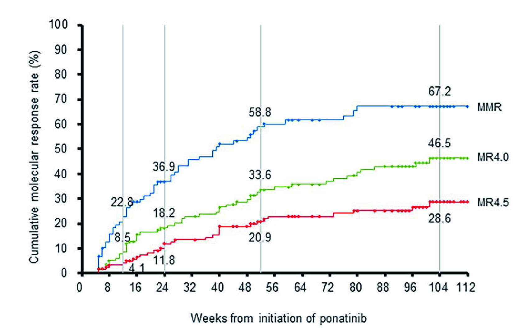 Among patients with CML-CP who had not achieved major molecular response (MMR) prior to treatment with ponatinib, the cumulative MMR rate at weeks 12, 24, 52 and 104 was 22.8%, 36.9%, 58.8%, and 67.2% (Figure 2), respectively1. Furthermore, in 19 patients with T315I mutation, the cumulative MMR rate at 12, 24, 52, and 104 weeks were 42.1%, 47.4%, 75.3%, and 75.3% respectively. In summary, the study demonstrated a generally favorable safety and efficacy of ponatinib in Japanese patients.