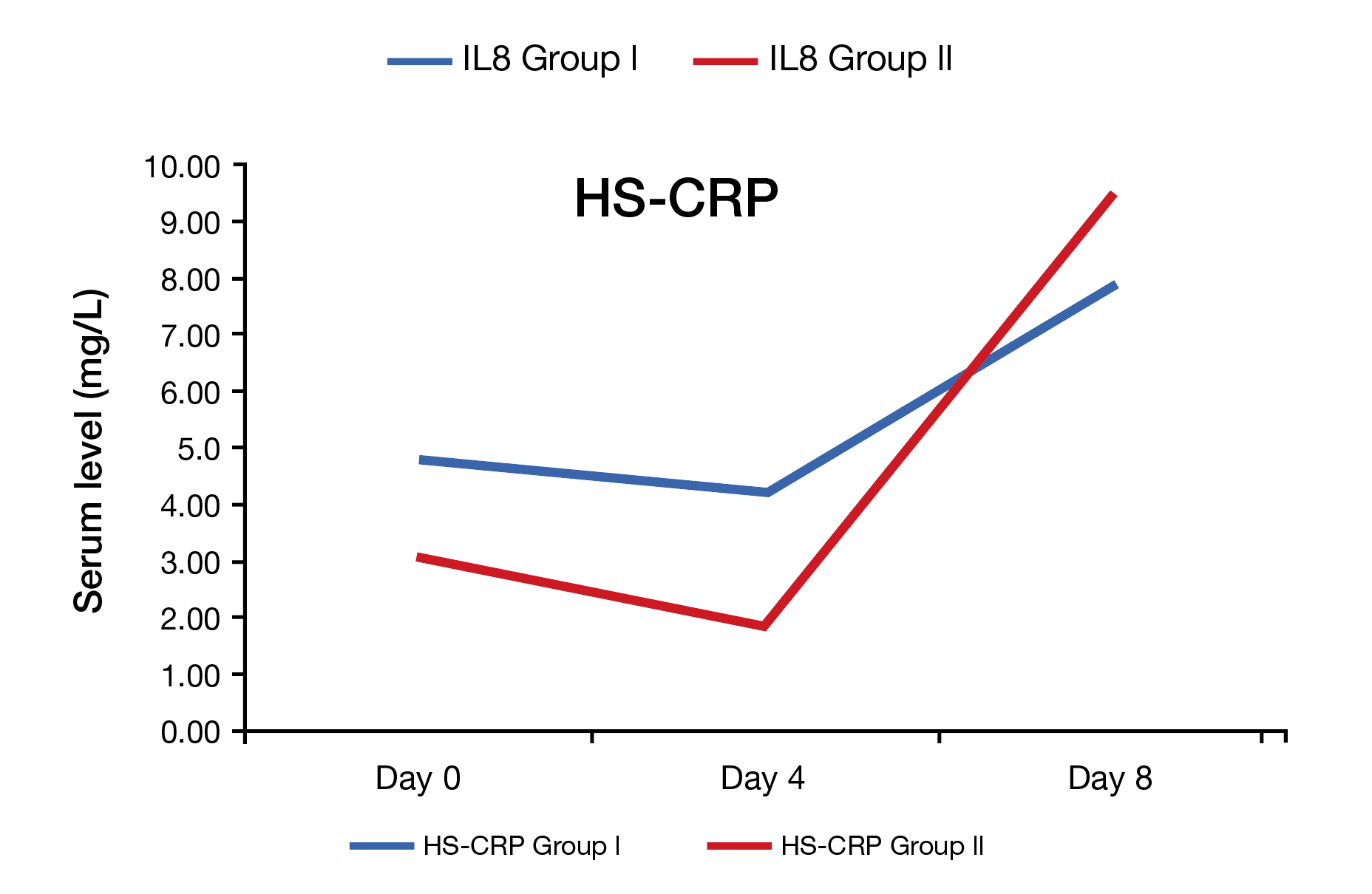 Figure 1. Comparison of inflammatory markers in both groups. Group l= IVFO group (n=20), and Group ll= control group (n=20)13. HS-CRP= high-sensitivity C-reactive protein. IVFO= intravenous fish oil.