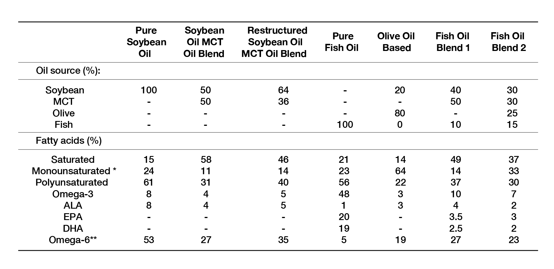 Table 1. Oil sources and major fatty acids (% of total) of commercially available lipid emulsions for use in parenteral nutrition. The red vertical boxes highlight different types of fish oils (pure fish oil, fish oil blend 1 and fish oil blend 2) and the red horizontal box highlights the omega 3 content of each parenteral nutrition. ALA, α-linolenic acid; EPA, eicosapentaenoic acid; DHA, docosahexaenoic acid. * mainly oleic acid (18:1n-9). ** Mainly linoleic acid (18:2n-6). Note that the fatty acid composition of fish oil is more variable than that of vegetable oils so that the precise contribution of different fatty acids may differ in different batches10