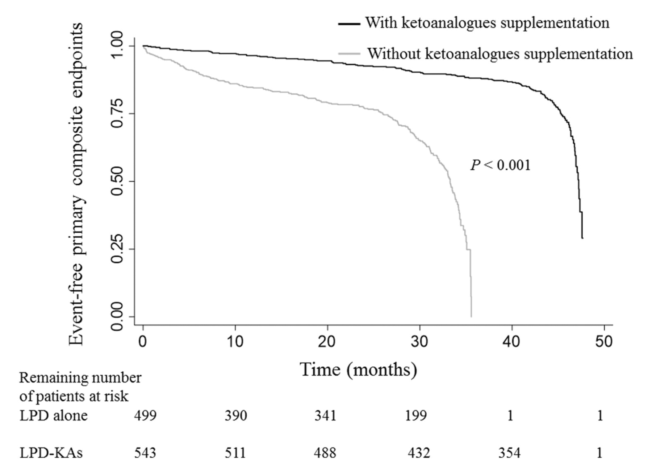 Figure 1. Kaplan–Meier estimates of primary composite endpoint in CKD patients on LPD with/without ketoanalogues supplementation11