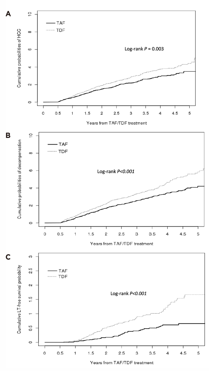 The results thus suggested that TAF is associated with better liver-related outcomes as compared to TDF, regardless of the presence of liver cirrhosis. Taking the potential impacts on the kidneys and bones of TDF into consideration, TAF would be the preferred treatment option in CHB management.