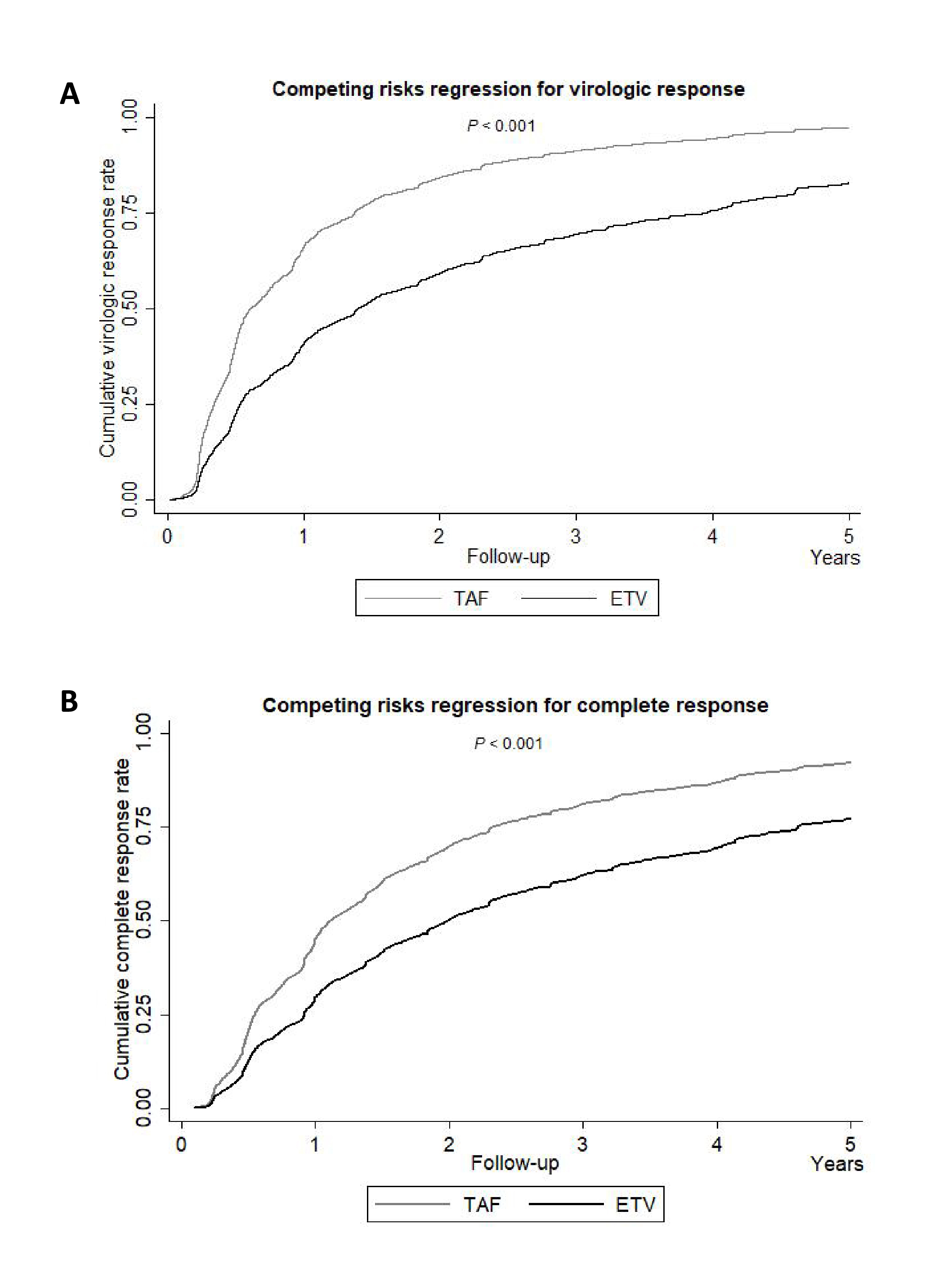 Figure 2. Competing risks regression for A) virologic response, B) complete response in TAF- and ETV-treated patients in overall cohort7
