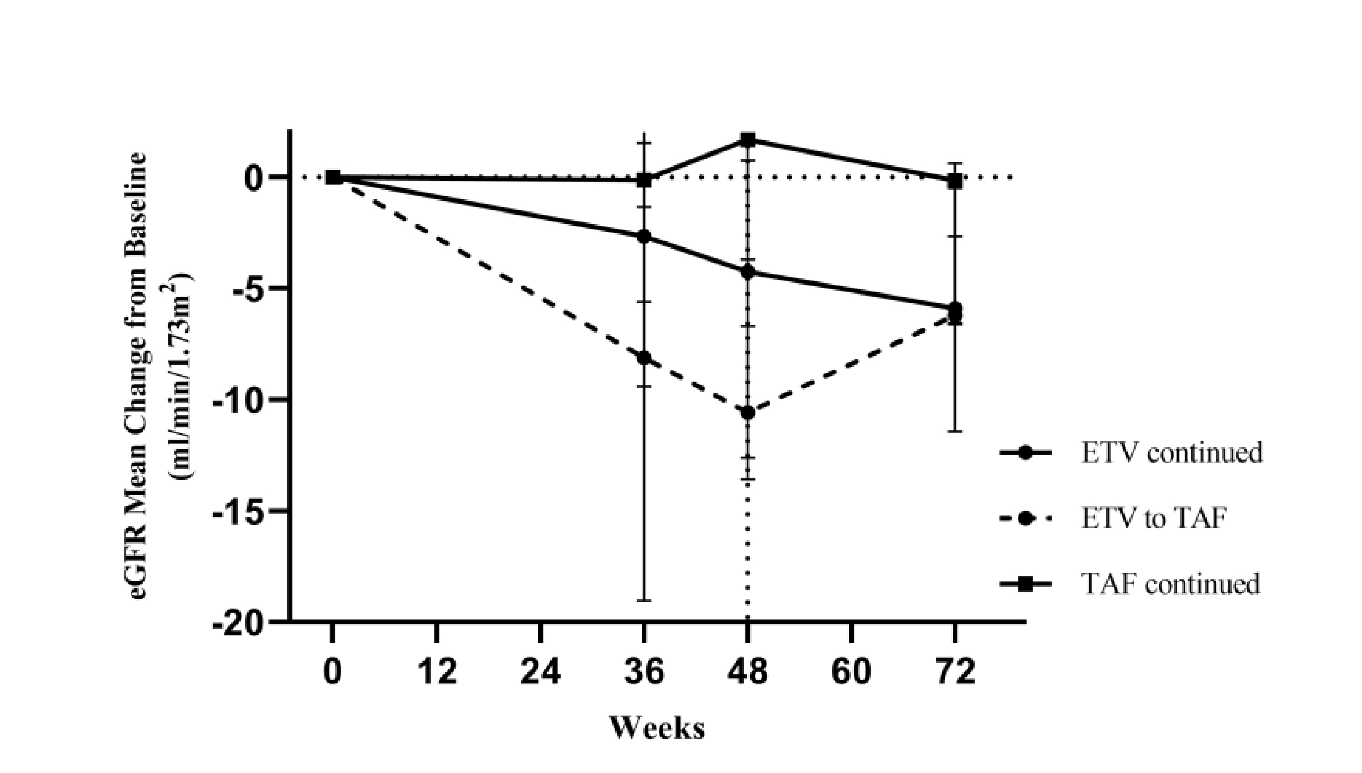 In the study, 7 (9.21%) patients in the ETV group were switched from ETV to TAF due to eGFR abnormality at week 48. Remarkably, at 24 weeks post-switching, the mean eGFR value in this group increased from 87.84 ml/min/1.73m2 to 92.02 ml/min/1.73m2 (Figure 3), whereas the change in eGFR from week 48 to week 72 in patients switched from ETV to TAF was significantly larger than that continued ETV (p=0.015)8. Therefore, switching from ETV to TAF would likely result in substantial improvement in renal function among ETV-treated patients with eGFR abnormalities.