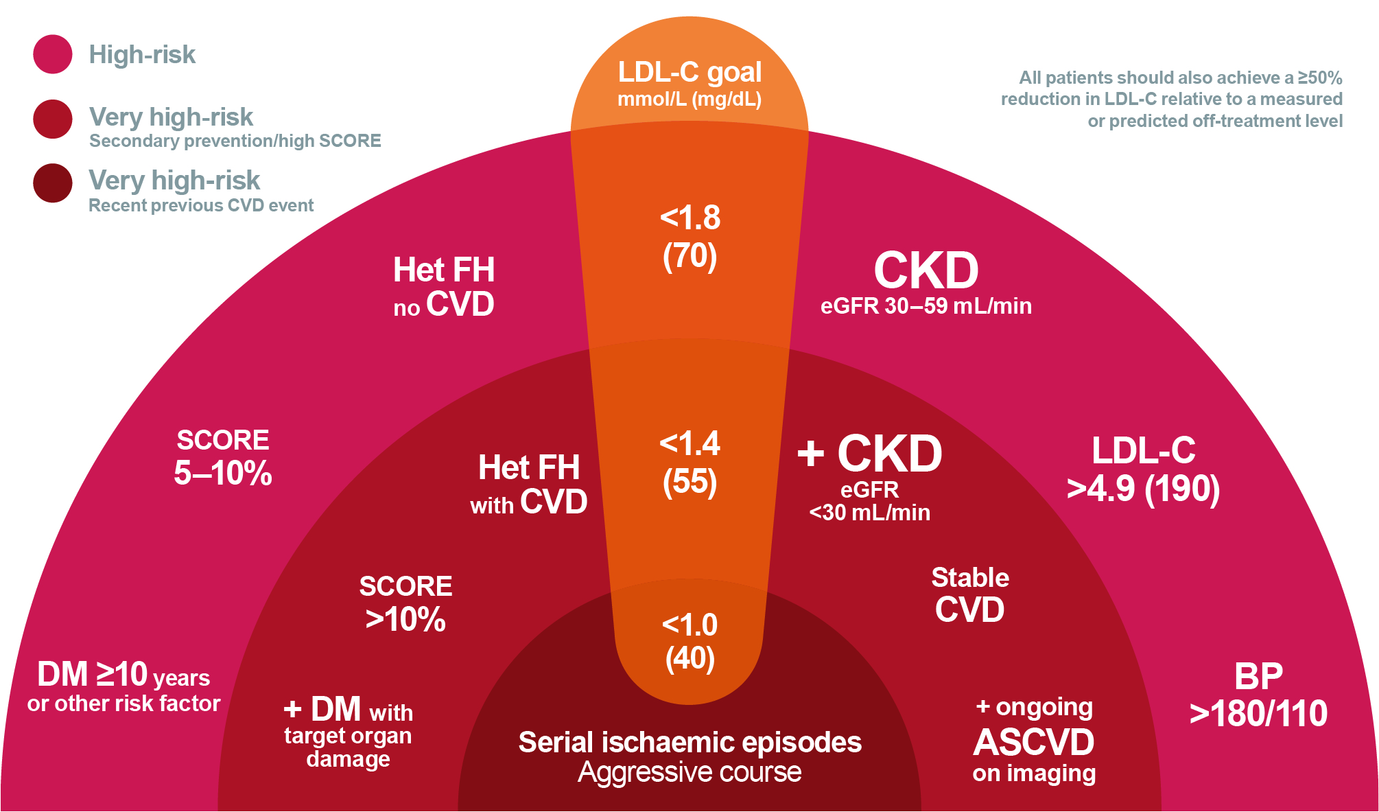 Figure 1. Schematic diagram on rational for intensive LDL-C lowering6. ASVD, atherosclerotic cardiovascular disease; BP, blood pressure; CKD, chronic kidney disease; CVD, cardiovascular disease; DM, diabetes mellitus; eGFR, estimated glomerular filtration rate; Het FH, heterozygous familial hypercholesterolaemia; LDL-C, low density lipoprotein cholesterol; SCORE, Systematic Coronary Risk Estimation