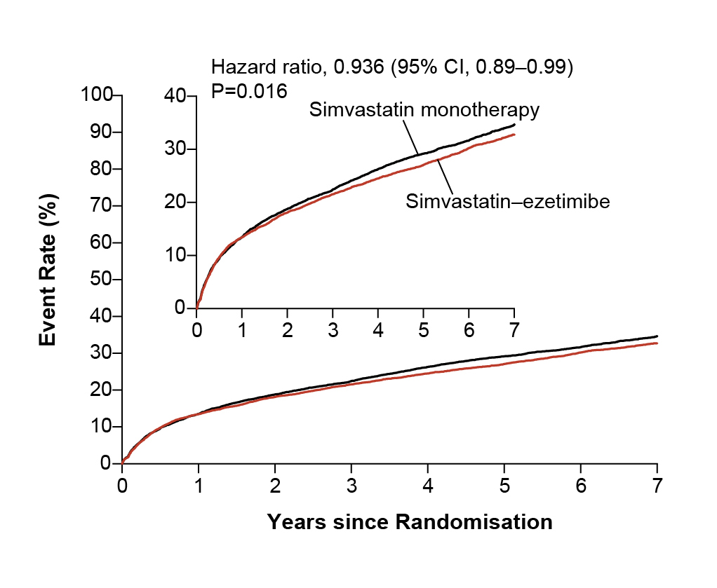 While statins have traditionally been the bread and butter for lipid lowering therapies (LLTs), the landscape of LLTs has expanded in the recent years with the emergence of numerous non-statin agents targeting atherogenic lipoproteins via different molecular areas12. One such agent is ezetimibe, a synthetic 2-azetidinone agent that inhibits cholesterol absorption at the brush border of the small intestine mediated by Niemann-Pick C1-Like-1 (NPC1L1) sterol transporter, in addition to upregulate LDL receptors to increase LDL clearance13,14. Despite these unique properties, ezetimibe monotherapy only reduces LDL-C by 15-20%15 and when co-administered with statin, it provides a mean LDL-C reduction of 18-25%16. Here, Prof. Cho shared the data from IMPROVE-IT, a double-blinded, randomised trial that evaluated the rate of reduction of cardiovascular (CV) events with the addition of ezetimibe to statin therapy. 18,144 patients hospitalised for acute coronary syndrome (ACS) within preceding 10 days and had LDL-C levels of 50 to 100 mg/dL (1.3 to 2.6 mmol/L) if they were receiving LLT or 50 to 125 mg/dL (1.3 to 3.2 mmol/L) if they were not receiving LLT were randomised to receive either a combination of simvastatin 40 mg and ezetimibe 10 mg or simvastatin 40 mg and placebo. The primary end point was a composite of CV death, nonfatal myocardial infarction (MI), unstable angina requiring rehospitalisation, coronary revascularisation (≥30 days after randomisation) or nonfatal stroke. These patients were followed up for 7 years, and the study reported the primary end point at 7 years was 32.7% in the simvastatin-ezetimibe group, compared with 34.7% in the simvastatin-monotherapy group (hazard ratio [HR] 0.936; 95% confidence interval [CI]: 0.89-0.99; p=0.016) (Figure 2), a 7% per year reduction in the primary end points17.