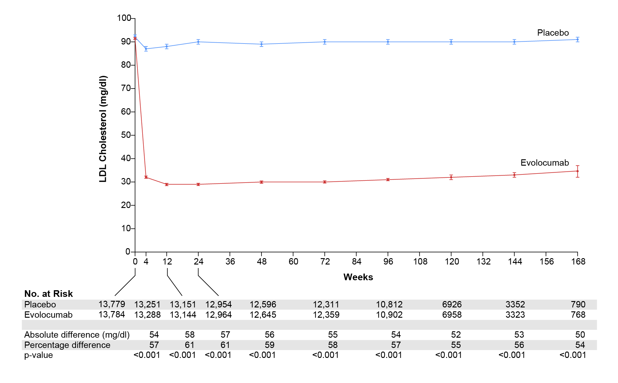 Figure 4. Low-density lipoprotein-cholesterol (LDL-C) over time. Shown are median values in the two study groups; I bars indicate 95% confidence intervals. Below the graph, the absolute and percentage reductions in LDL-C level in the evolocumab group are compared with those in the placebo group and are presented as least-squares means or means25.