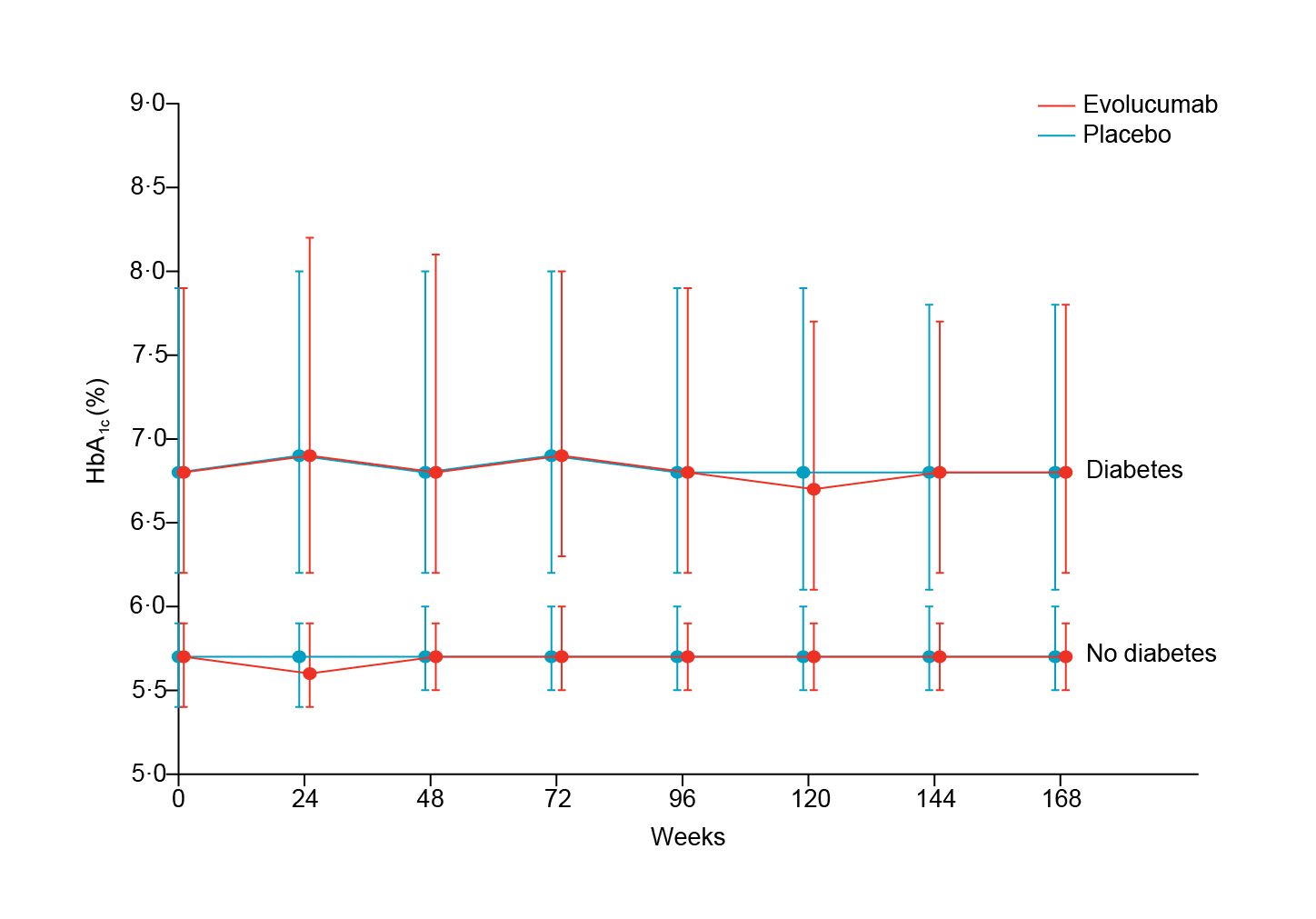 Figure 5. HbA1c overtime. Median values in the evolocumab and placebo treatment groups, for patients with and without diabetes. Error bars are IQRs27. IQRs, interquartile ranges.