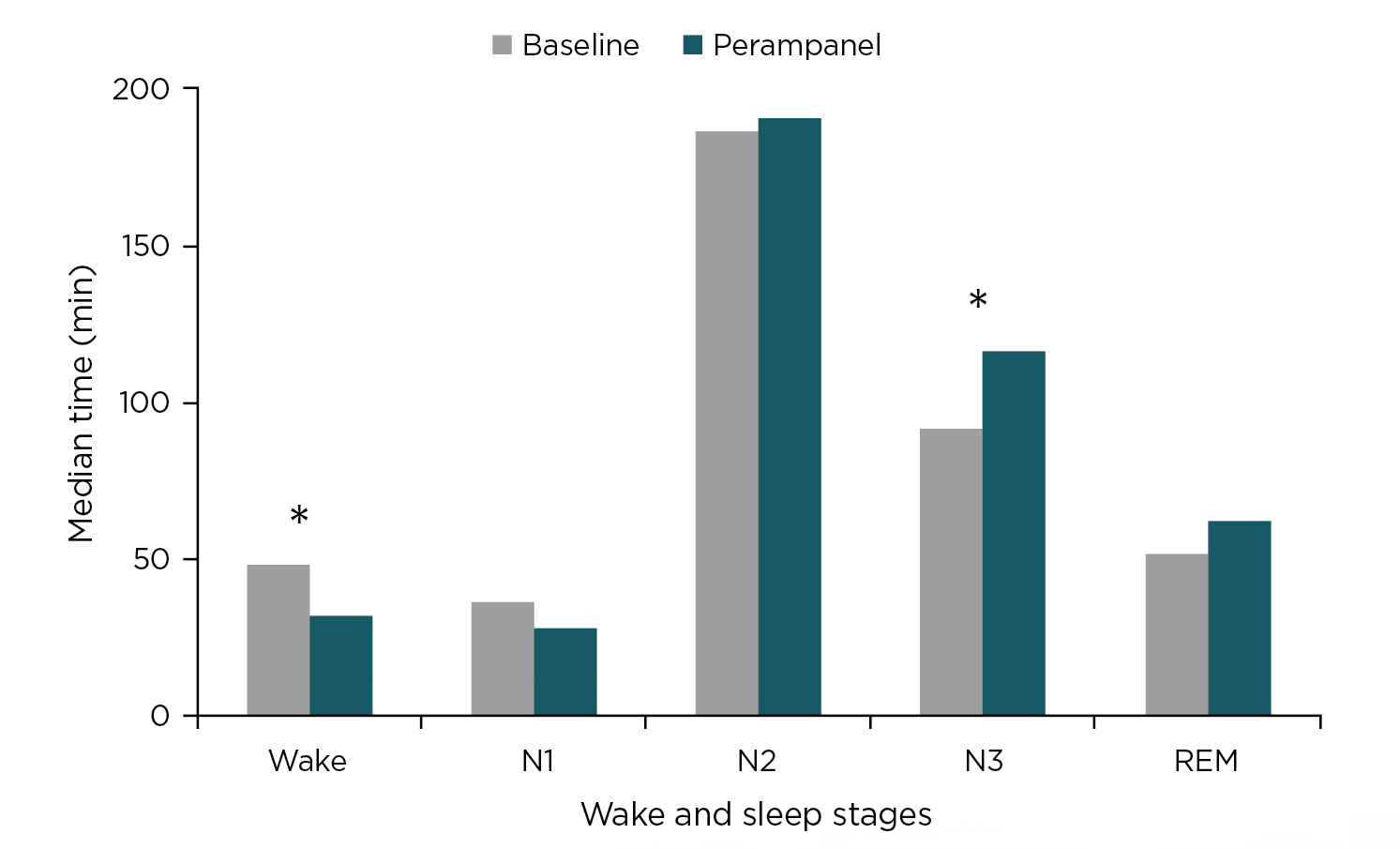 Figure 1: Median duration of wake and sleep stages (N1, N2, N3 and REM) before and after 12 weeks of perampanel and 4 weeks with a stable dose (4-8 mg q.d.). *p<0.051.