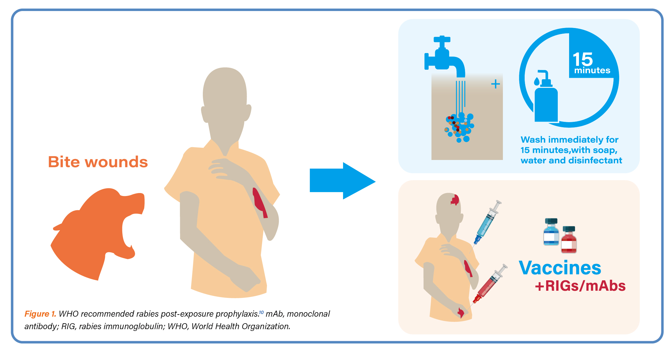 Dr. Quiambao started her presentation with the epidemiology of rabies. RABV belongs to a group of viruses referred to as lyssaviruses.1 More than 99% of human rabies cases are transmitted via dogs.1 Although canine rabies can be eliminated with the necessary tools in place for the control and elimination rabies remains a serious public health problem in more than 100 countries and territories, mainly in poor and rural areas of Asia and Africa.1,2,10,11 RABV can spend days to weeks in the body before it invades the nervous system.3 Once clinical symptoms appear, rabies is virtually 100% fatal.4 Rabies deaths are preventable with timely PEP which prevents the virus from reaching the central nervous system. PEP consists of extensive wound washing; a course of human rabies vaccine; and, if indicated, administration of RIGs (Figure 1).10