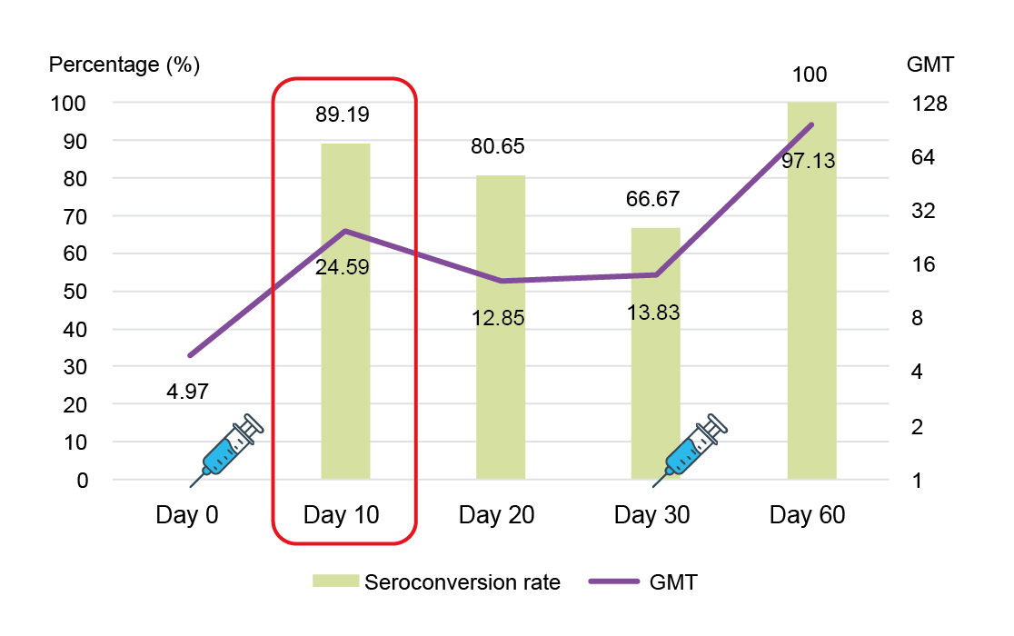 Figure 1: Seroconversion rate and GMT between Day 0 and Day 60.21 GMT, geometric mean titer.