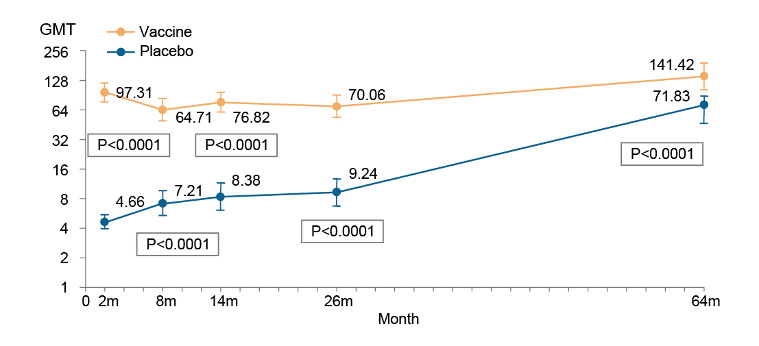 Figure 2: GMT between Day 0 and Month 64.22 GMT, geometric mean titer.