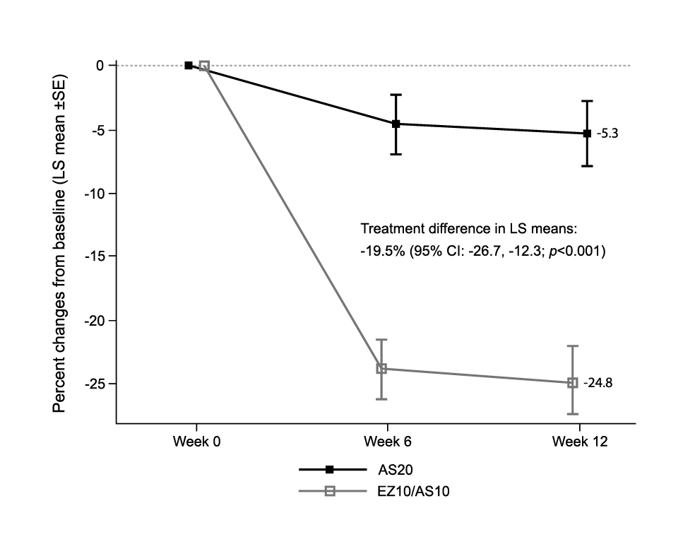 As a key regimen of combined therapy controlling LDL-C levels, the clinical performance of atorvastatin/ezetimibe has been supported in numerous clinical studies. For instance, a recent phase 3 randomised controlled trial (RCT) by Qian et al. (2022), which involved 454 Chinese patients with hypercholesterolemia uncontrolled with statin monotherapy, demonstrated that the percentage change from baseline in LDL-C was statistically greater with atorvastatin/ezetimibe 10/10mg treatment (n=88) compared with atorvastatin 20mg monotherapy (n=89) (treatment difference: −19.5%, p<0.001, Figure 1). The results also indicated that the safety profile was comparable between the atorvastatin/ezetimibe and atorvastatin monotherapy groups. Although increased number of urinary protein present (2.3% vs 1.1%), cerebral infarction (2.3% vs 1.1%), and hypertension (2.3% vs 0%) were reported in atorvastatin/ezetimibe group versus atorvastatin monotherapy group, no statistically significant difference in the occurrence of adverse events was observed9. Therefore, the findings suggested that atorvastatin/ezetimibe treatment offers a more effective treatment option for LDL-C management than escalated doses of atorvastatin, without compromising the safety profile.