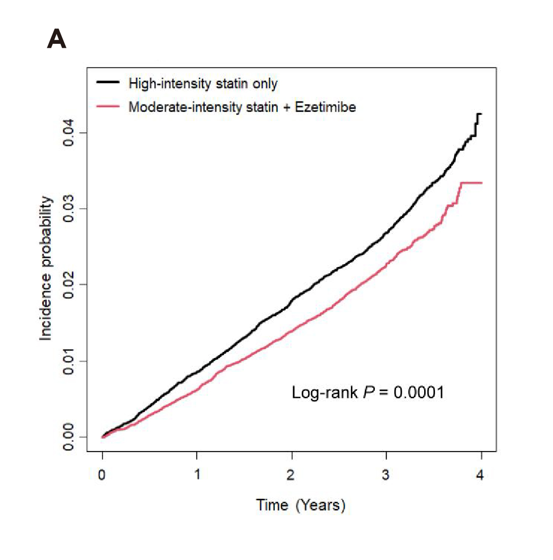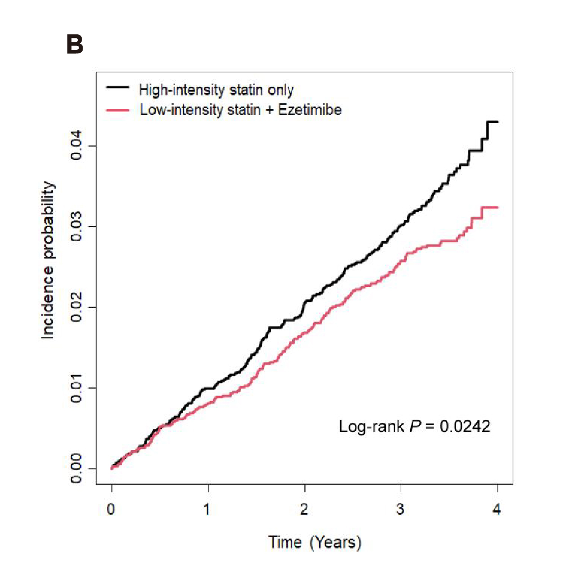 Undoubtedly, achieving the LDL-C target will likely result in improved health outcomes. A propensity-matched nationwide cohort study in Korea, which compared the preventive effect on CVD and all-cause death of low- or moderate-statin with ezetimibe combined therapy to that of high-intensity statin monotherapy among people without pre-existing CVD, suggested that the moderate-intensity statin with ezetimibe regimen significantly reduced the risk of composite outcome (hazard ratio [HR]: 0.84, p<0.001, Figure 2A) as well as individual myocardial infarction (MI, HR: 0.81, p=0.005) and stroke (HR: 0.78, p=0.005) compared to high-intensity statin monotherapy. Moreover, low-intensity statin with ezetimibe also significantly reduced the risk of the composite outcomes (HR: 0.80, p=0.024, Figure 2B) compared to high-intensity statin monotherapy2. Hence, the results indicated that statin/ezetimibe combined therapy was superior to high-intensity statin monotherapy in preventing composite outcomes among the participants.