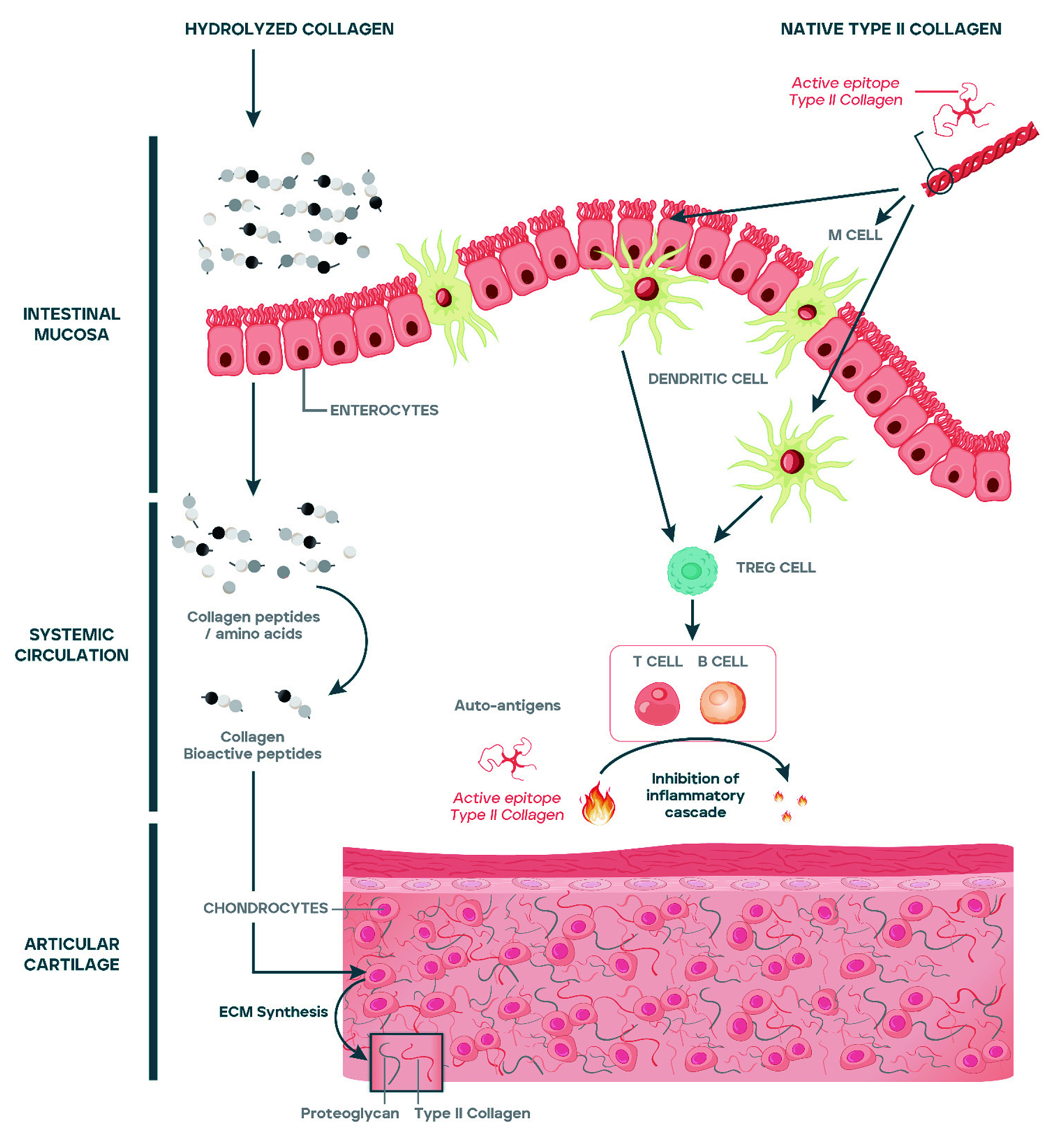 Collagen is the most abundant protein in the extracellular matrix (ECM) and connective tissues of vertebrates. Based on their structure, supramolecular organisation, and functional features, 28 types of collagens have been described. Particularly, type-II collagen is the primary constituent of articular cartilage, which protects against wear and tear associated with joint mobilisation and movement. Interestingly, undenatured type-II collagen, also known as native type-II collagen or UCII, is type-II collagen that has not been broken down by heat, acids or enzymes, and has been reported to elicit an immune-mediated response called oral tolerance3. Importantly, UCII is different from hydrolysed collagen (collagen peptides, collagen hydrolysate, or HCII), which is digested and absorbed in body3.
