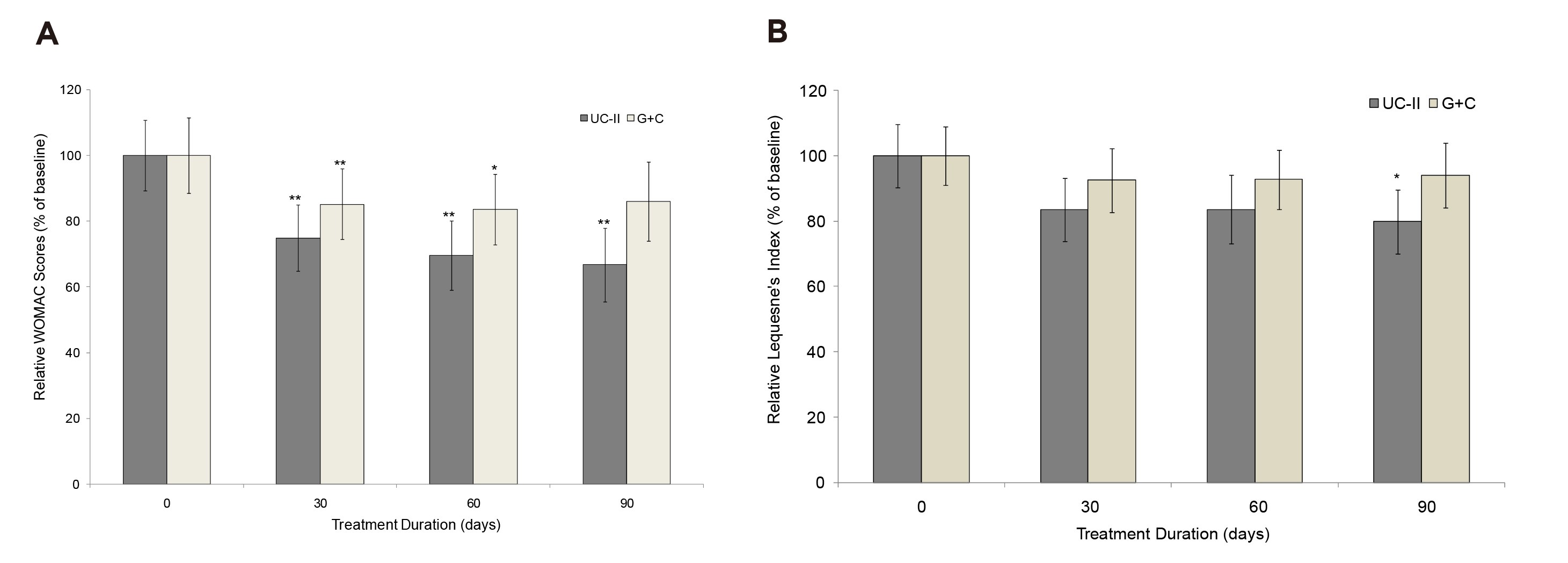 The landmark trial demonstrating the clinical benefits of UCII against OA was conducted by Crowley et al. (2009). In the trial, 52 patients with OA were randomly assigned to receive oral supplementation with either 40mg UCII (n=26) or glucosamine plus chondroitin (G+C, n=26). The effects of UCII in reducing pain were observed since the first follow-up on Day 30 (Figure 2A). After 90 days of treatment, UCII yielded significant improvements in all assessments. Essentially, greater reductions in WOMAC score (33% [UCII] vs 14% [G+C], Figure 2A), VAS score (40% [UCII] vs 15.4% [G+C]), and Lequesne’s functional index (20% [UCII] vs 6% [G+C], Figure 2B) were observed in UCII against G+C22. The results implied that UCII supplementation was effective in countering OA-related pain than G+C and improving the patient's QoL.