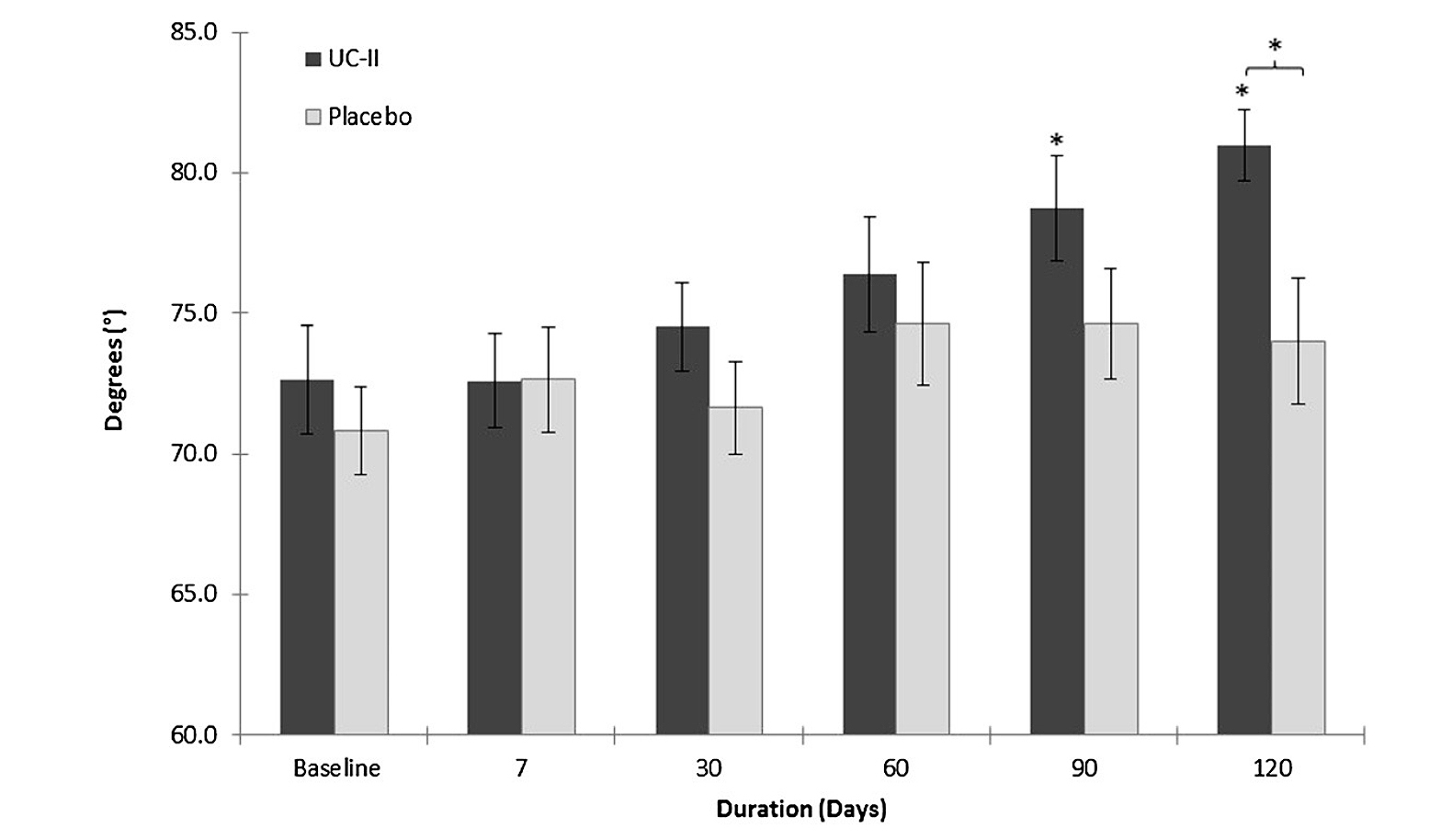 Figure 3: Improved knee extension upon UC-II supplementation24, *p≤0.05: significant difference versus baseline or placebo