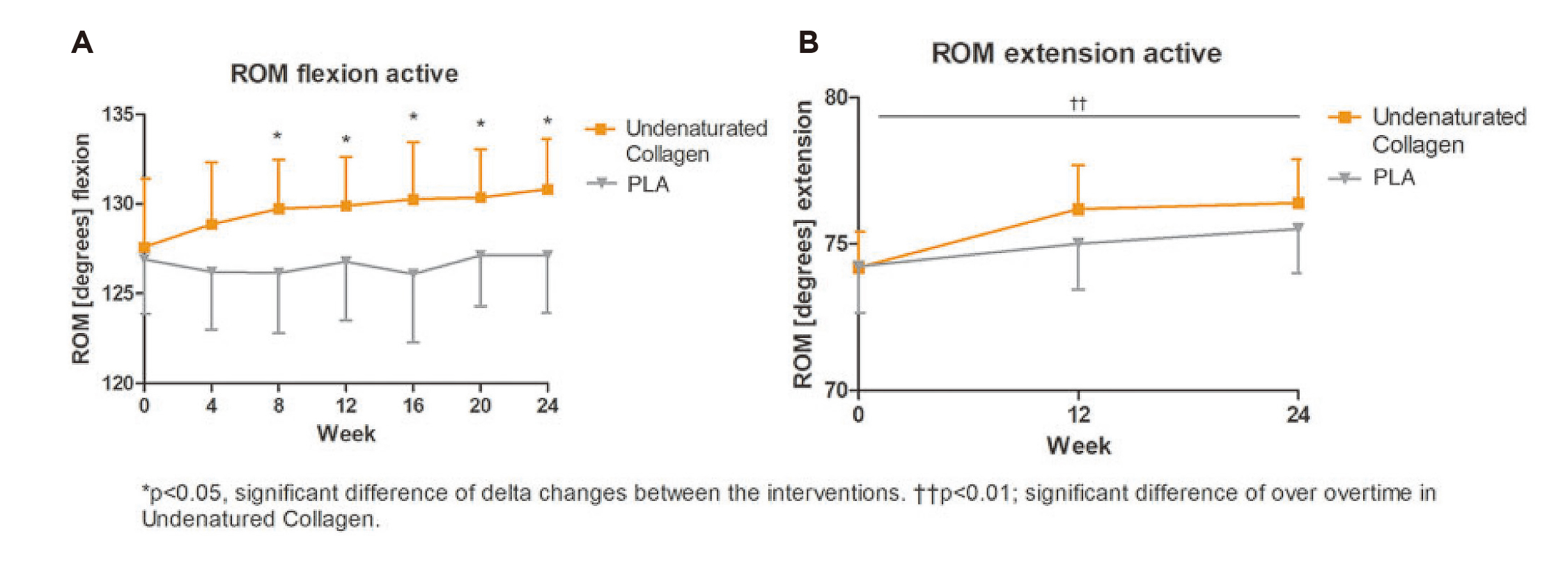 More recently, the RCT by Schon et al. (2022), which recruited 96 healthy subjects with activity-related joint discomfort, reported that 24 weeks of daily UCII supplementation significantly increased knee range of motion (ROM) flexion (3.23º vs 0.21º, p=0.025) and extension (2.21º vs 1.27º, p=0.0061) versus placebo (Figure 4A and 4B)25. Thus, daily UCII supplementation improved knee joint ROM flexibility and extensibility in healthy subjects with activity-related joint discomfort. UCII showed increasing knee extension in healthy adults and preventing them from developing more serious joint problems, implying potential ease the ageing burden from public health perspectives.