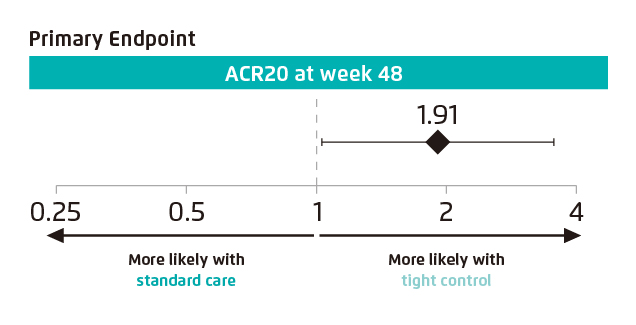 The TICOPA trial was the first study to compare a T2T approach with standard care and has informed subsequent guideline recommendations. The primary outcome was the proportion of patients achieving an American College of Rheumatology (ACR) 20 (ACR20) response at 48 weeks. Patients in the T2T arm were almost twice as likely to achieve the primary efficacy endpoint as compared to patients in the standard care arm. The odds of achieving an ACR20 response at 48 weeks were higher in the tight control group than in the standard care group (odds ratio [OR] 1.91; p=0.039; Figure 1). The study interpreted that tight control of PsA disease activity using the T2T approach significantly improved joint and skin outcomes for newly diagnosed PsA patients with no unexpected SAEs observed7.