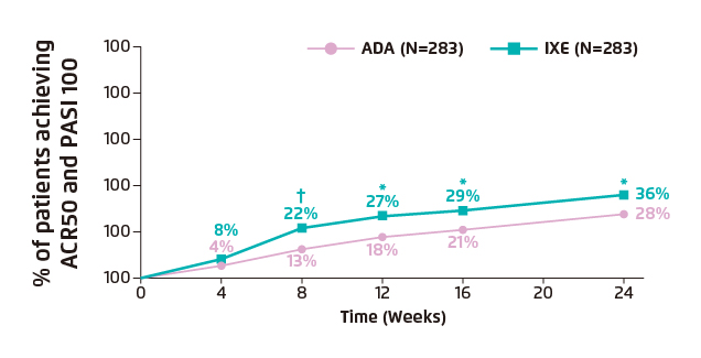 Figure 2. Clinical response rates for primary outcome through week 24 showing the percentage of patients achieving ACR50 and PASI 100 simultaneously11.
