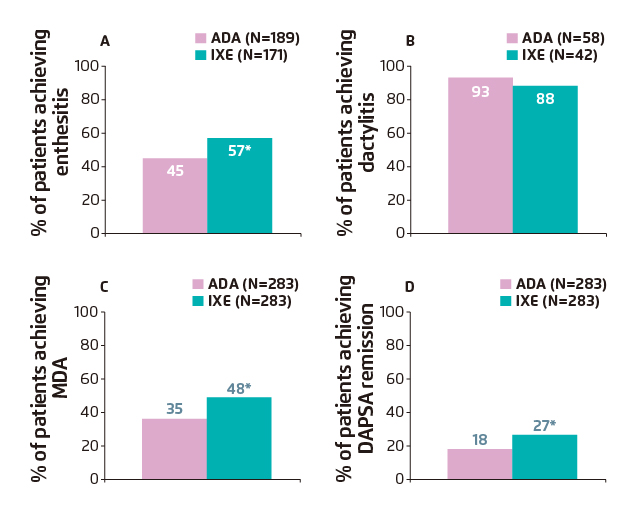 Additional secondary outcomes related to joints included the resolution of enthesitis as measured by the Spondyloarthritis Research Consortium of Canada Enthesitis Index (SPARCC Enthesitis Index=0) among patients with enthesitis at baseline (SPARCC Enthesitis Index >0) and resolution of dactylitis as measured by the Leeds Dactylitis Index-Basic (LDI-B=0) among patients with dactylitis at baseline (LDI-B >0). Post hoc categorical analyses included the percentage of patients achieving sustained DAPSA≤4 remission. Overall, results demonstrated significantly higher clinical response rates with IXE compared to ADA at week 24 for SPARCC Enthesitis Index (IXE: 57% vs. ADA: 45%; p=0.019) (Figure 3A), dactylitis (LDI-B=0) (IXE: 88% vs. ADA: 93%; p=0.658) (Figure 3B) and T2T endpoints of MDA (IXE: 48% vs. ADA: 35%; p=0.003) (Figure 3C) and DAPSA remission (IXE: 27% vs. ADA: 18%; p=0.016) (Figure 3D)9.