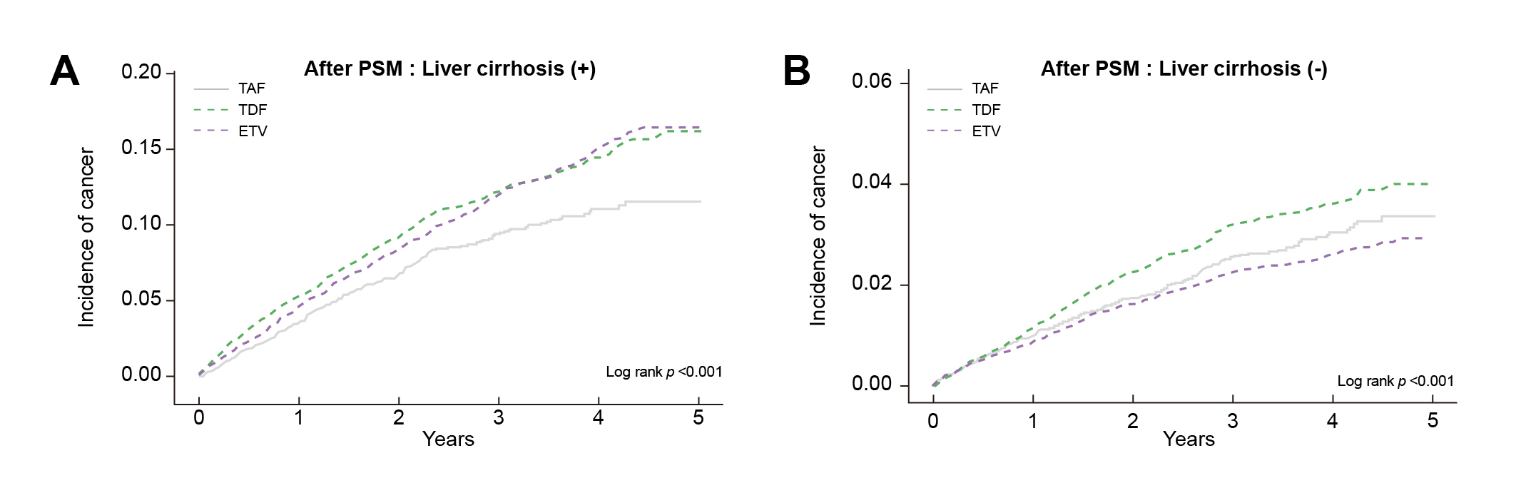 Figure 1: Cumulative incidence of HCC after propensity score matching (PMS) among A) patients with liver cirrhosis, and B) patients without liver cirrhosis2