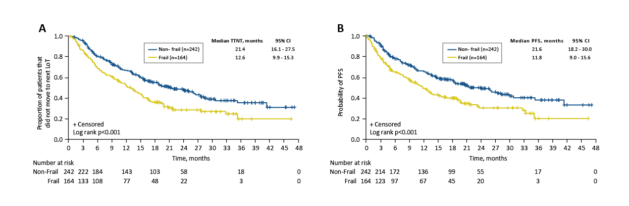 Figure 2. Kaplan–Meier analyses. (A) TTNT, and (B) PFS, by frailty status17,18. CI, confidence interval; LoT, line of therapy; PFS, progression-free survival; TTNT, time-to-next treatment.