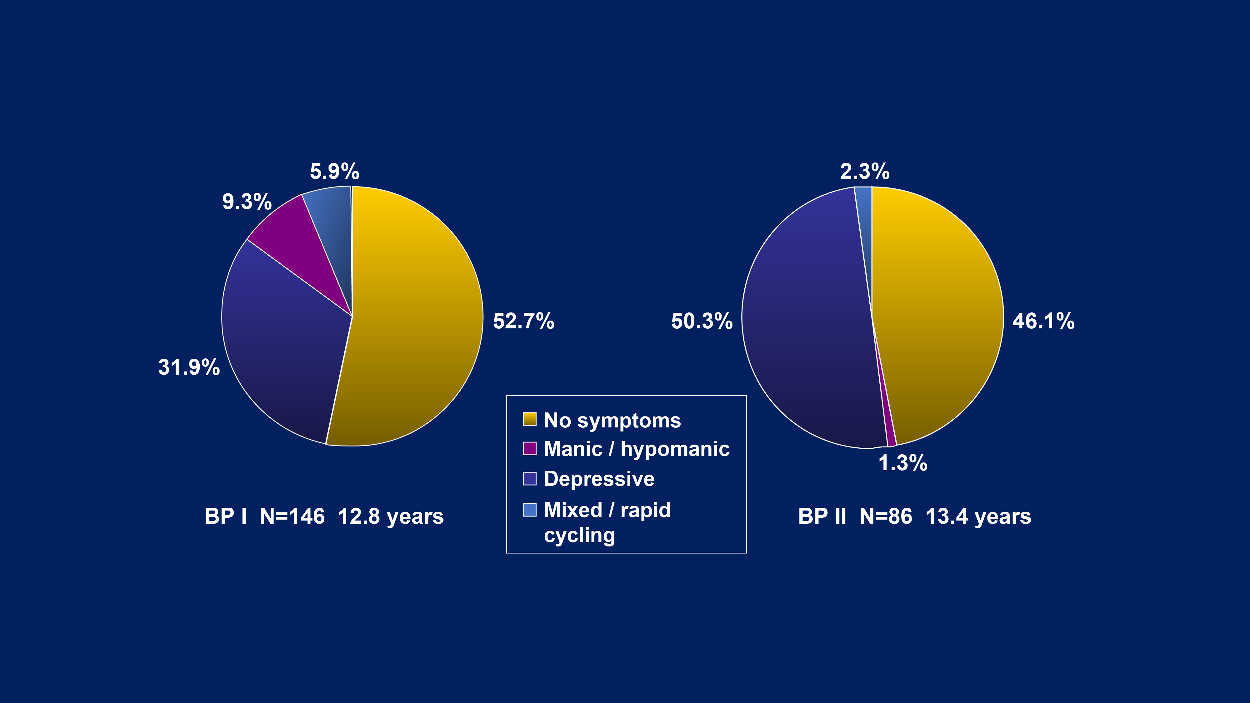 Prof. Hopwood highlighted that the symptomatic structure of bipolar disorder is primarily depressive rather than manic. Notably, Judd et al. (2002) reported that patients with bipolar disorder I (BP-I) experienced 3 times more depressive symptoms (31.9% of total follow-up weeks) than manic symptoms (9.3% of weeks)3. In bipolar disorder II (BP-II), depressive symptoms (50.3% of weeks) dominated the course over hypomanic (1.3% of weeks) and cycling/mixed (2.3% of weeks) symptoms (Figure 1)4. Accordingly, a focus on the treatment for bipolar depression is needed.