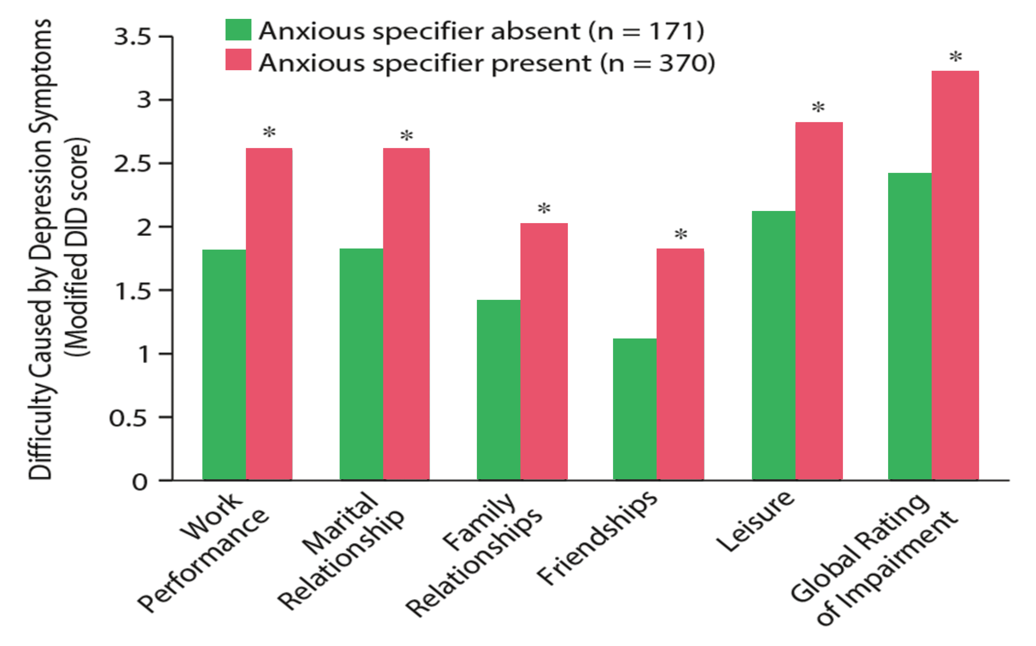Figure 2. Impact of the anxious distress specifier on psychosocial functioning in patients with MDD6 , *p<0.001