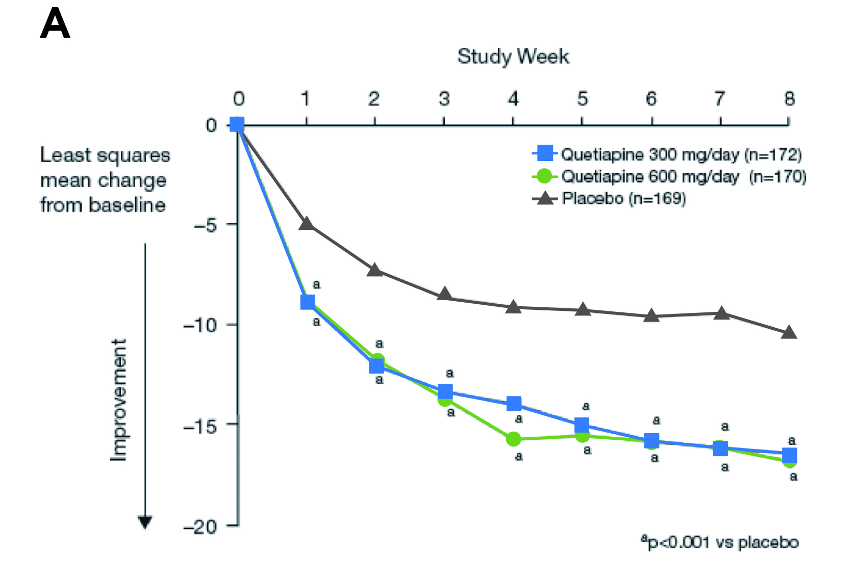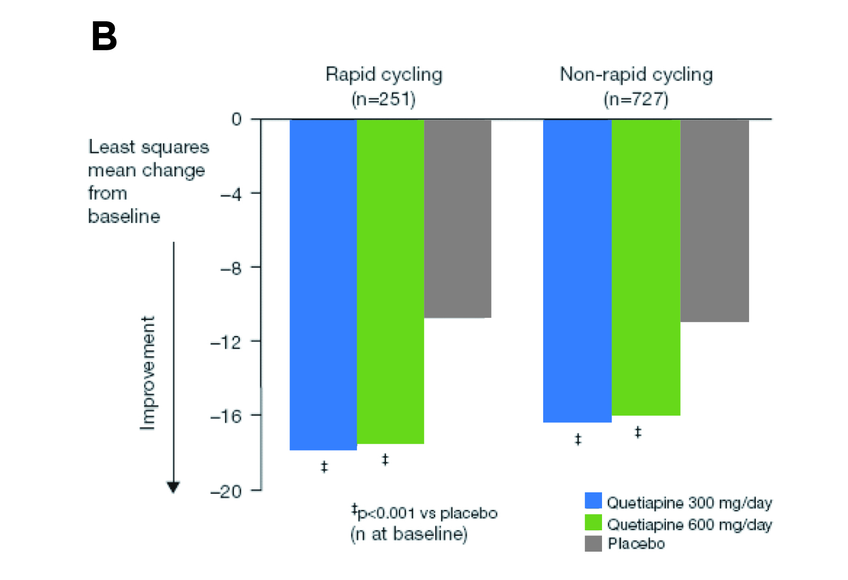 The landmark trials demonstrating the efficacy of Quetiapine in managing bipolar depression are the BOLDER I & II trials. In the BOLDER I trial, patients meeting DSM-4 criteria for bipolar I (n=360) or bipolar II (n=182) depression were randomly assigned to 8 weeks of Quetiapine (600 or 300 mg/day) or placebo. The results demonstrated that Quetiapine at either dose achieved significant improvement in Montgomery-Åsberg Depression Rating Scale (MADRS) total scores compared with placebo from week 1 onward (Figure 4A)11. While bipolar with a rapid cycling course is a clinical challenge, an 8-week Quetiapine treatment, both 600 and 300 mg/day, was shown to significantly improve MADRS score in bipolar patients, regardless of rapid cycling courses, in the BOLDER II trial (Figure 4B)12,13.