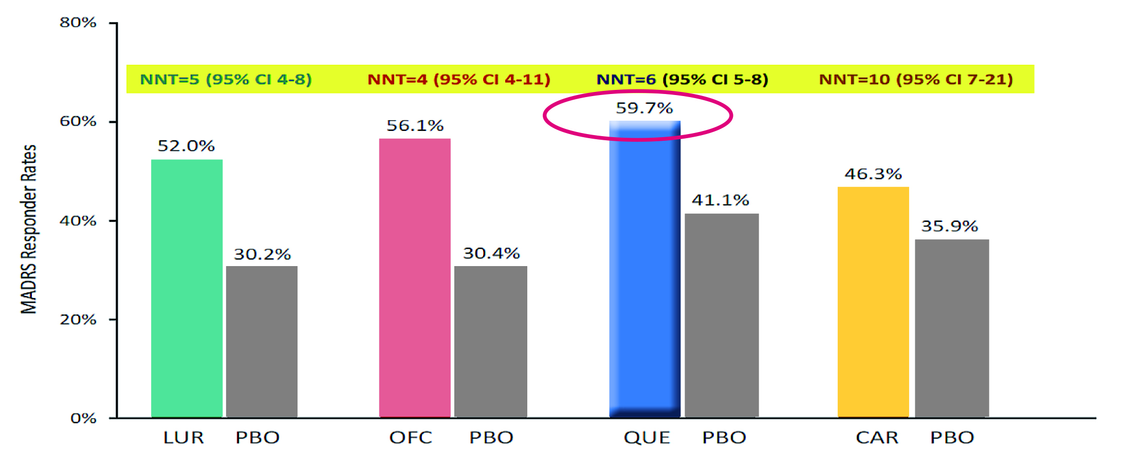 Figure 6. The MADRS responder rates of different therapies , LUR: Lurasidone, QUE: Quetiapine, CAR: Cariprazinem, PBO: placebo, NNT: number needed to treat, CI: confidence interval