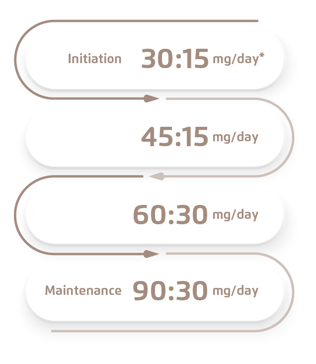 * The dose titration is in split-dose regimen according to Hong Kong prescribing information of tolvaptan: Initial dose at 60 mg/day (45 mg + 15 mg). Titrate upward to 90 mg/day (60 mg + 30 mg), then to a target dose of 120 mg/day (90 mg + 30 mg), if tolerated, with at least weekly intervals between titrations.