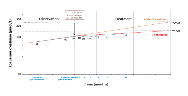 During first 1.5 years of treatment with tolvaptan, the trend in increasing serum creatinine level has been slowed down compared to the projected trend without treatment (Figure 2). Patient reported that waist pain has been reduced as a sign of symptom alleviation. To avoid dehydration, increased daily water consumption of 3 to 5 L was essential to compensate the water loss that polyuria and nocturia brought about. Treatment of tolvaptan continued for the patient.