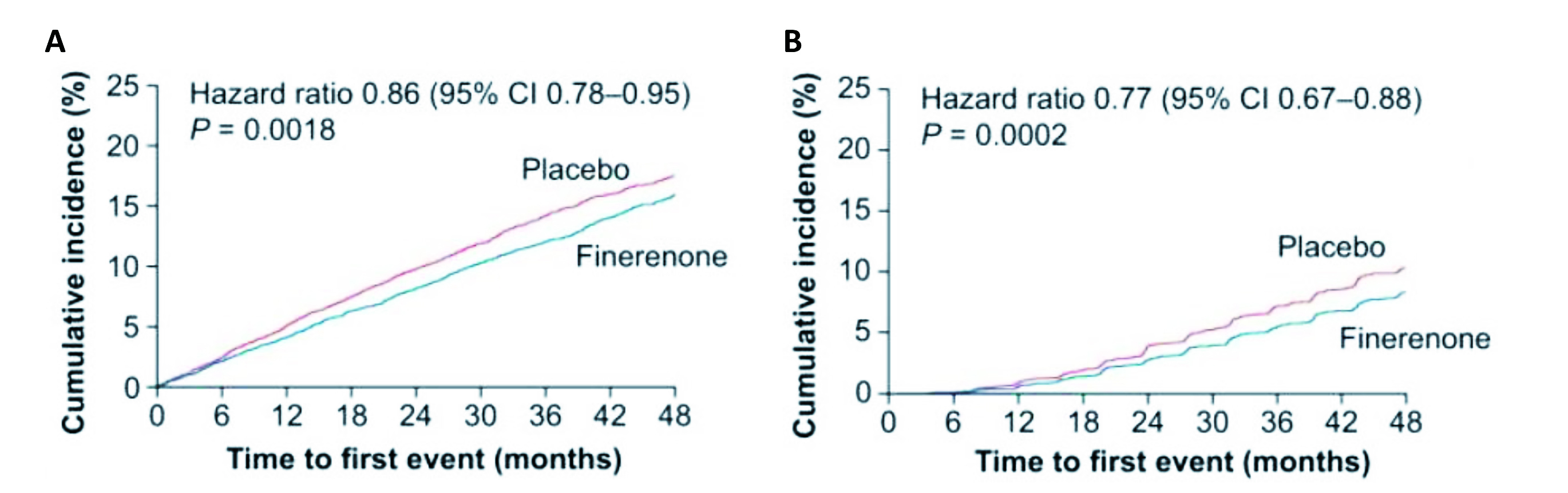 Figure 3: Time to efficacy outcomes, A) composite CV outcomes, B) composite kidney outcomes16