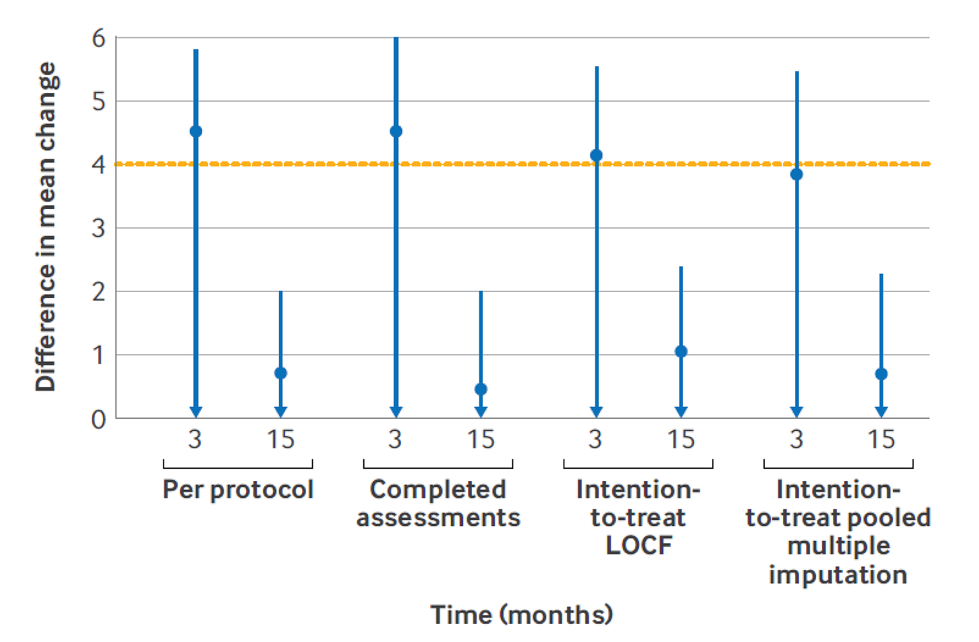 Figure 1: Primary outcome (per protocol analysis): non-inferiority analysis for ISI at 3 and 15 months in Tai Chi and CBT-I groups.1 Sensitivity analyses: completed assessments, intention-to-treat last observation carried forward (LOCF), and intention-to-treat pooled multiple imputation