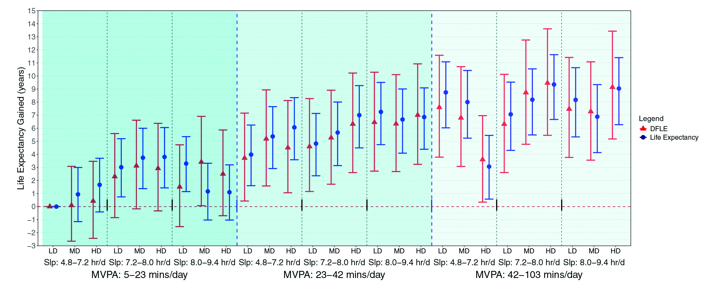 Figure 1: Multivariable-adjusted lifespan and healthspan associated with joint sleep, physical activity, and nutrition exposures.5 DFLE, Disease-Free Life Expectancy; HD, High Diet Quality; LD, Low Diet Quality; MD, Medium Diet Quality; Slp, Sleep