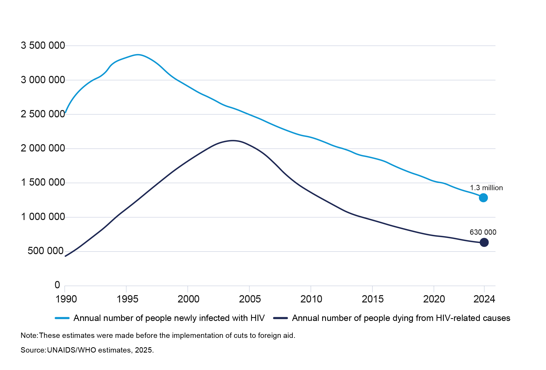 Figure 1: Global trends in people acquiring HIV and people dying from HIV-related causes (1990–2024)1