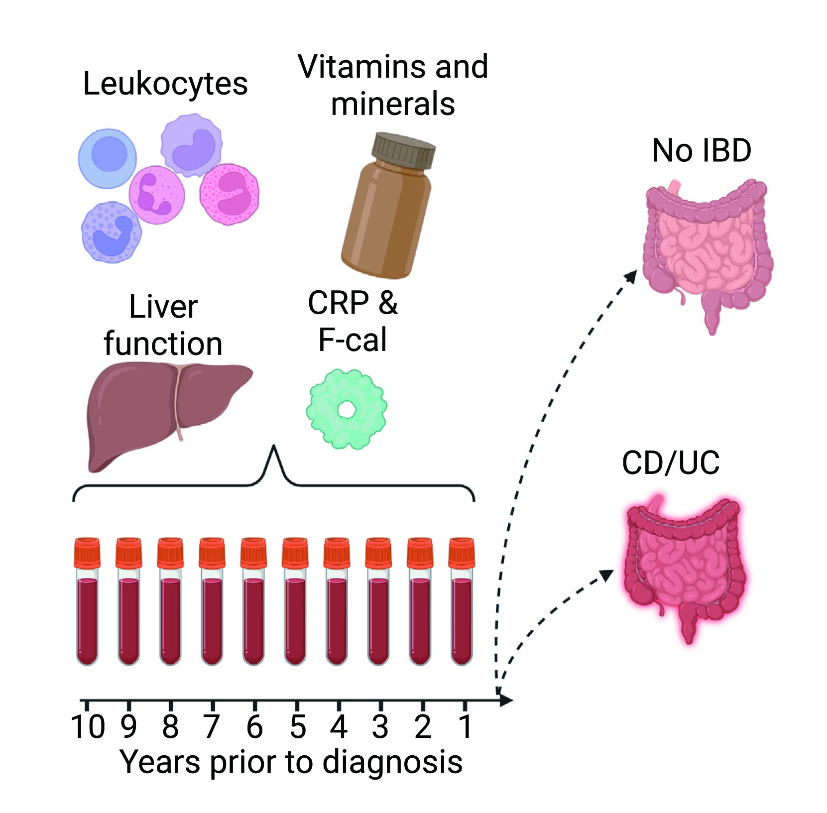 Inflammatory bowel disease (IBD) has a higher prevalence in developed western countries than in East Asia, with about 120 to 200 cases per 100,000 for ulcerative colitis (UC) and 50 to 200 cases per 100,000 for Crohn¡¦s Disease (CD) in 2014, and the numbers are on the rise. Timely medical intervention is necessary to minimise the extent of bowel damage in IBD patients, which underscores the need for a better understanding of IBD during the preclinical phase. Scientists from Aalborg University in Copenhagen analysed the measurements from 17 haematological and biochemical parameters in over 20000 IBD patients to identify biomarkers of clinical interest. It was discovered that levels of neutrophils, leukocytes and platelets were higher in CD cases than in healthy control up to 8 years before a diagnosis of CD; however, five years before a CD diagnosis, levels of monocyte also became higher in those who developed CD than in control cases, while that of iron, albumin and bilirubin decreased. A similar trend was observed in UC patients, yet the difference in levels of biomarkers was not evident until three years before the diagnosis of UC. Nevertheless, most of the changes detected (except faecal calprotectin) were within normal ranges of the respective tests, thereby increasing the difficulty of detecting abnormalities in the biomarkers in clinical practice (Figure 2). This study provided insights into the immunological changes during the preclinical phase of IBD and had future implications for developing IBD treatment strategies and therapeutic targets.